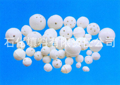 Perforated ceramic ball is developed on the basis of inert ceramic ball. It has an adequate mechanical strength, chemical and thermal stability as the normal inert one; furthermore it has higher dispersion and flux of the fluids, more surface area and lower resistance resulting from the perforated holes on the ball body. As a new efficient support and covering material of catalyst, it has been widely used in oil refinery, chemical, fertilizer, natural gas and environmental protection industries since put into market.